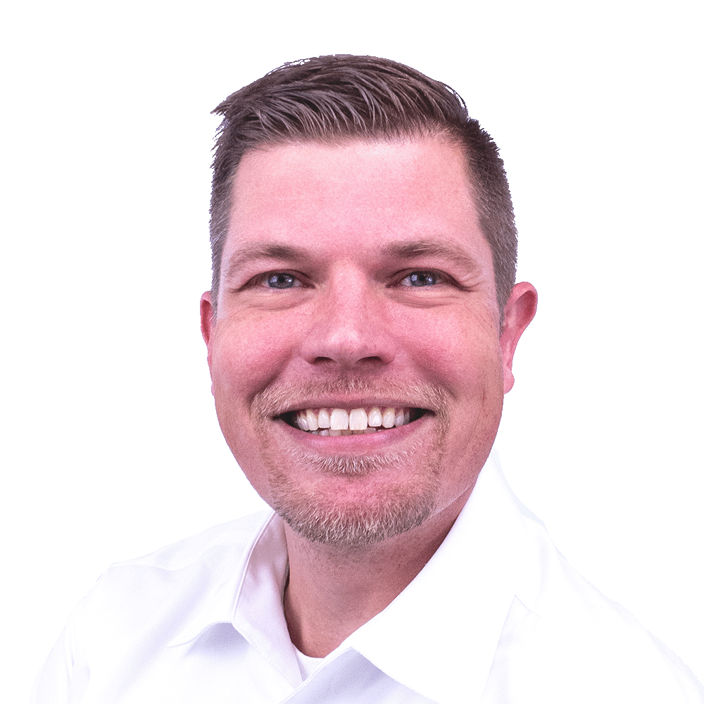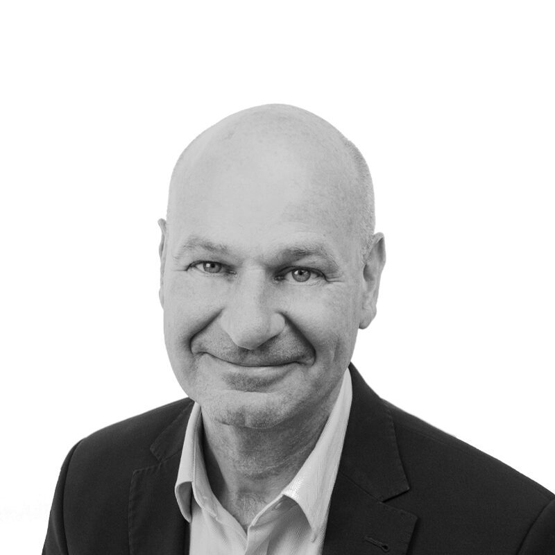 Black and white portrait headshot of a smiling man with short hair and light stubble, facing the camera.